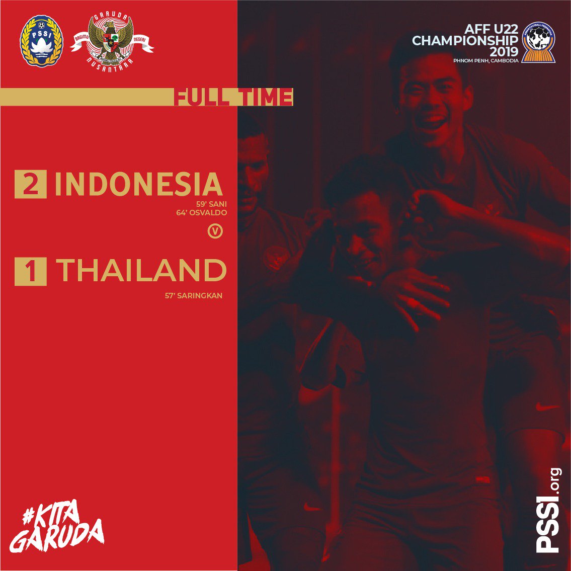 Garuda Muda Indonesia berhasil keluar sebagai pemenang Piala AFF U-22 2019. Berlangsung di Stadion Olimpiade, Phnom Penh, Kamboja, pada Selasa (26/2), Timnas Indonesia berhasil mengalahkan Thailand dengan skor 2-1.